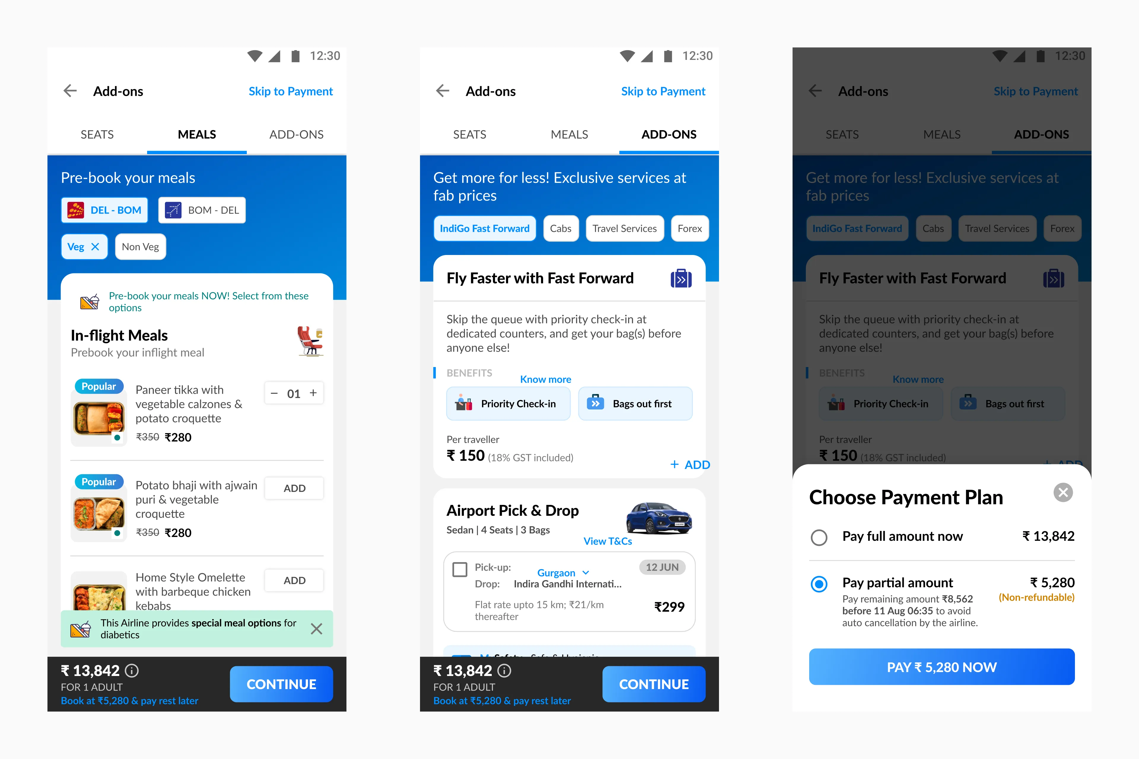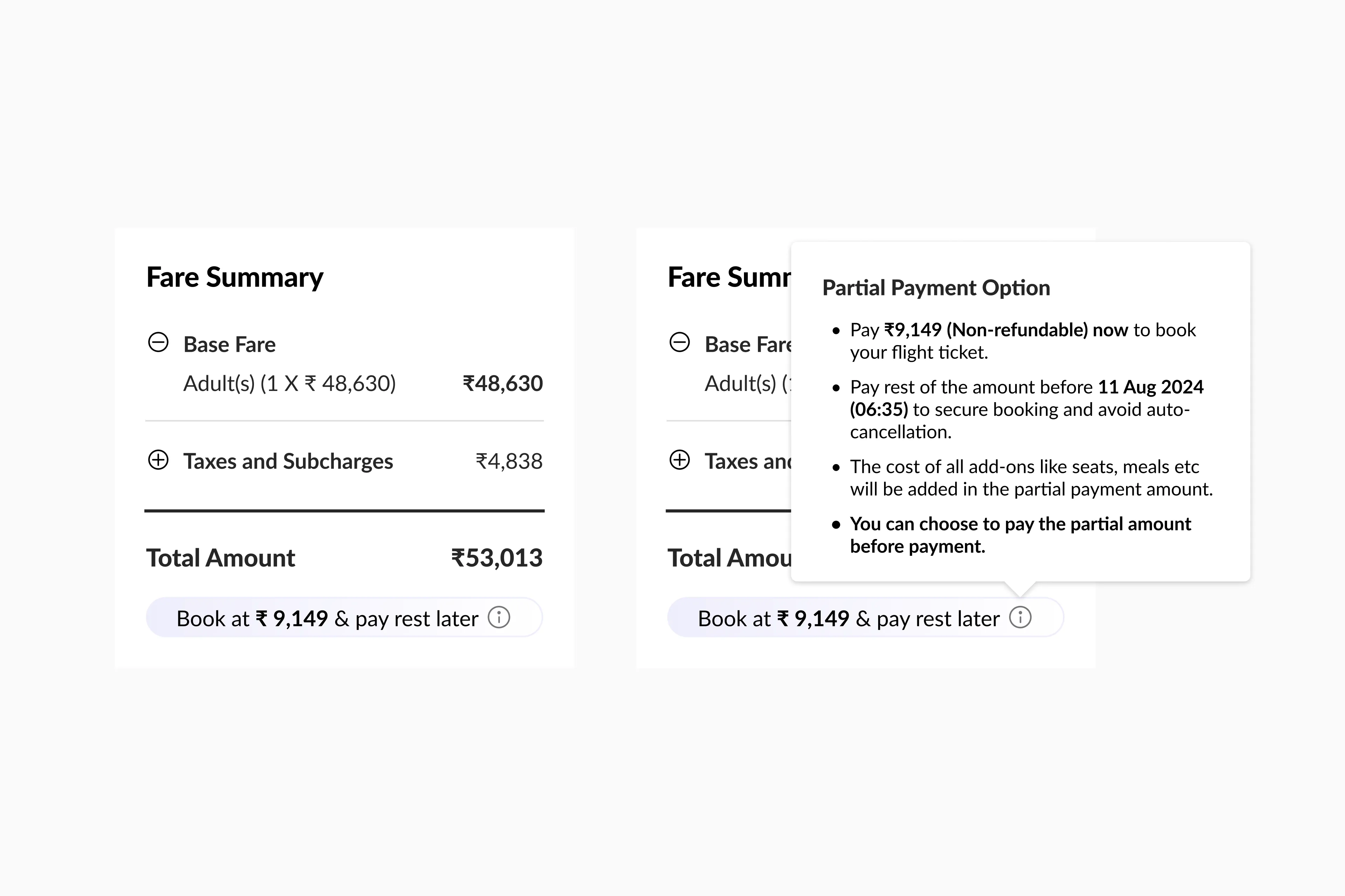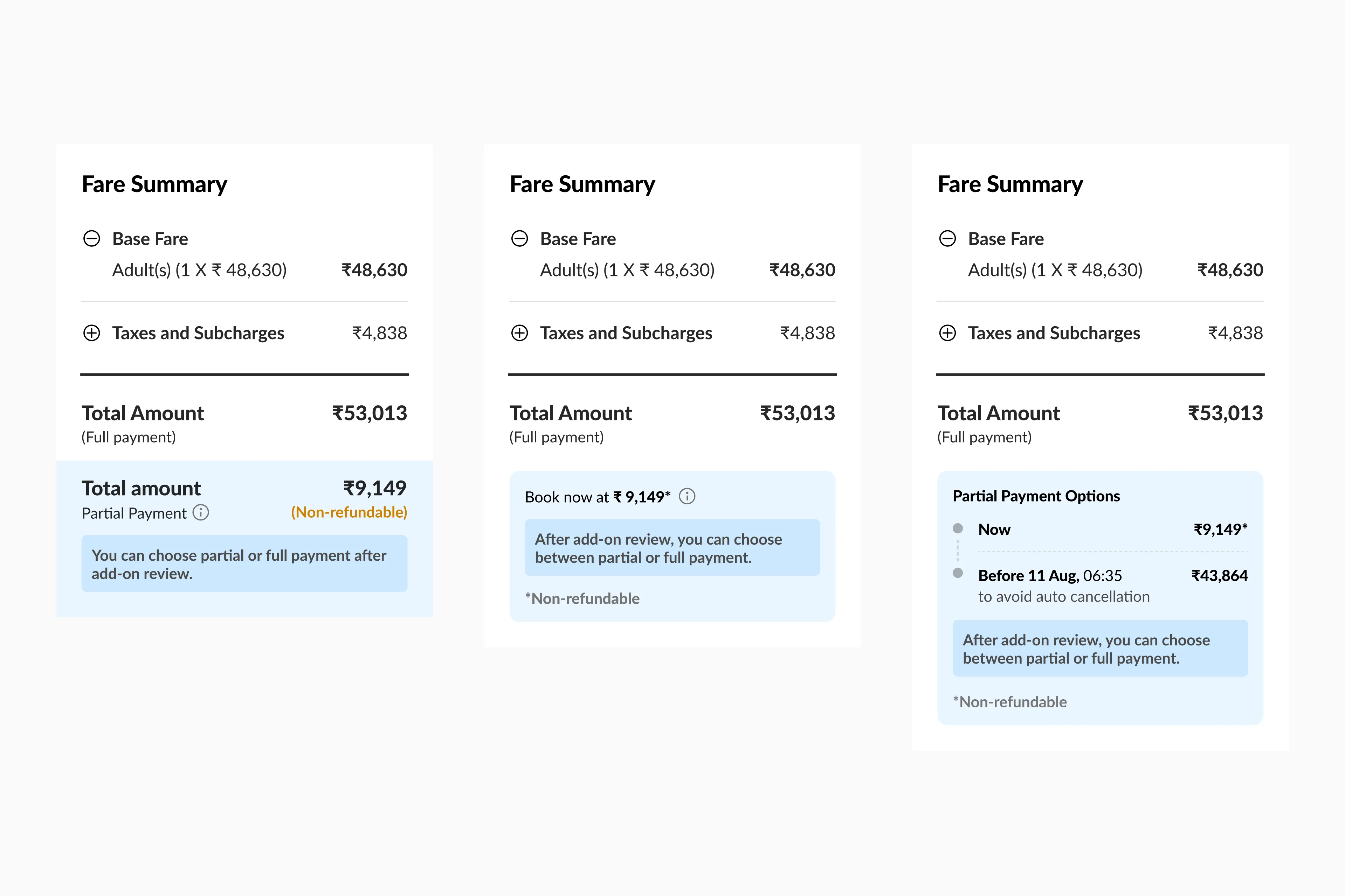 After extensive discussions with stakeholders, we decided that the final iteration should include not just the partial payment amount but also additional information such as: 1. Calling out that partial amount is non-refundable. 2. Deadline to pay remaining amount. 3. To call out that seats, meals, etc., add-ons will be included in the partial amount. 4. When the user can choose between partial payment and full payment. Here’s how fare family card will look like in action.