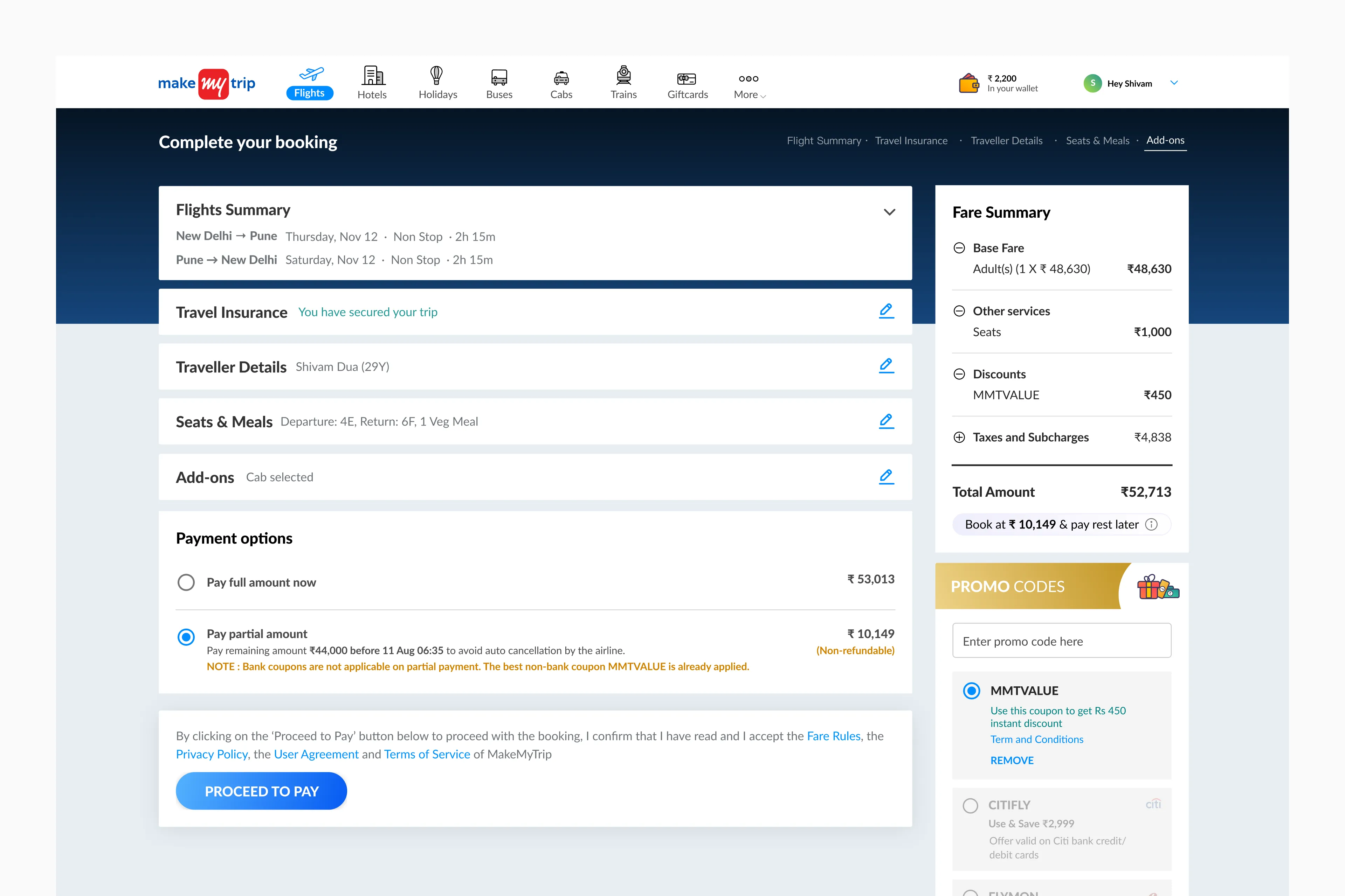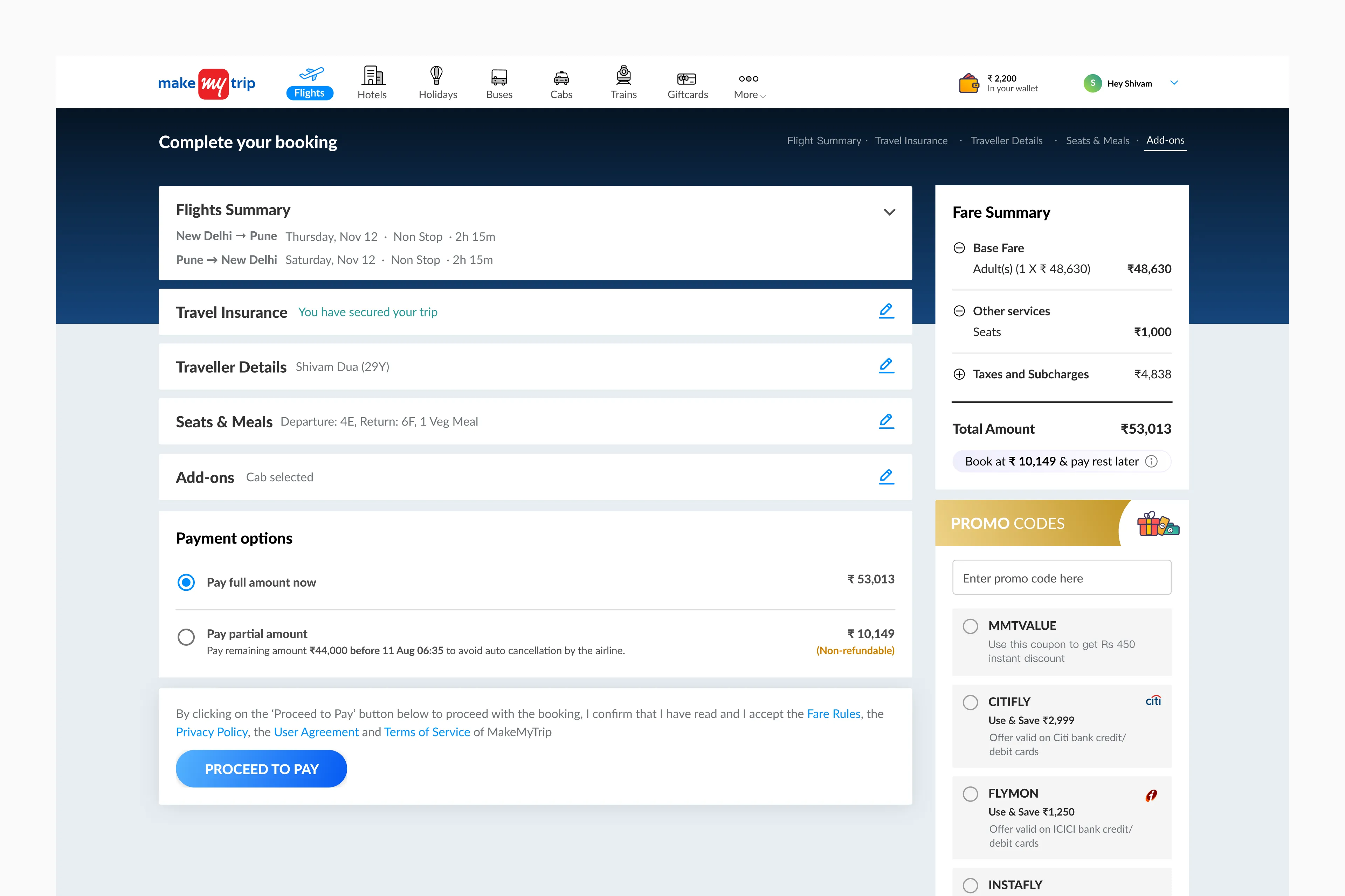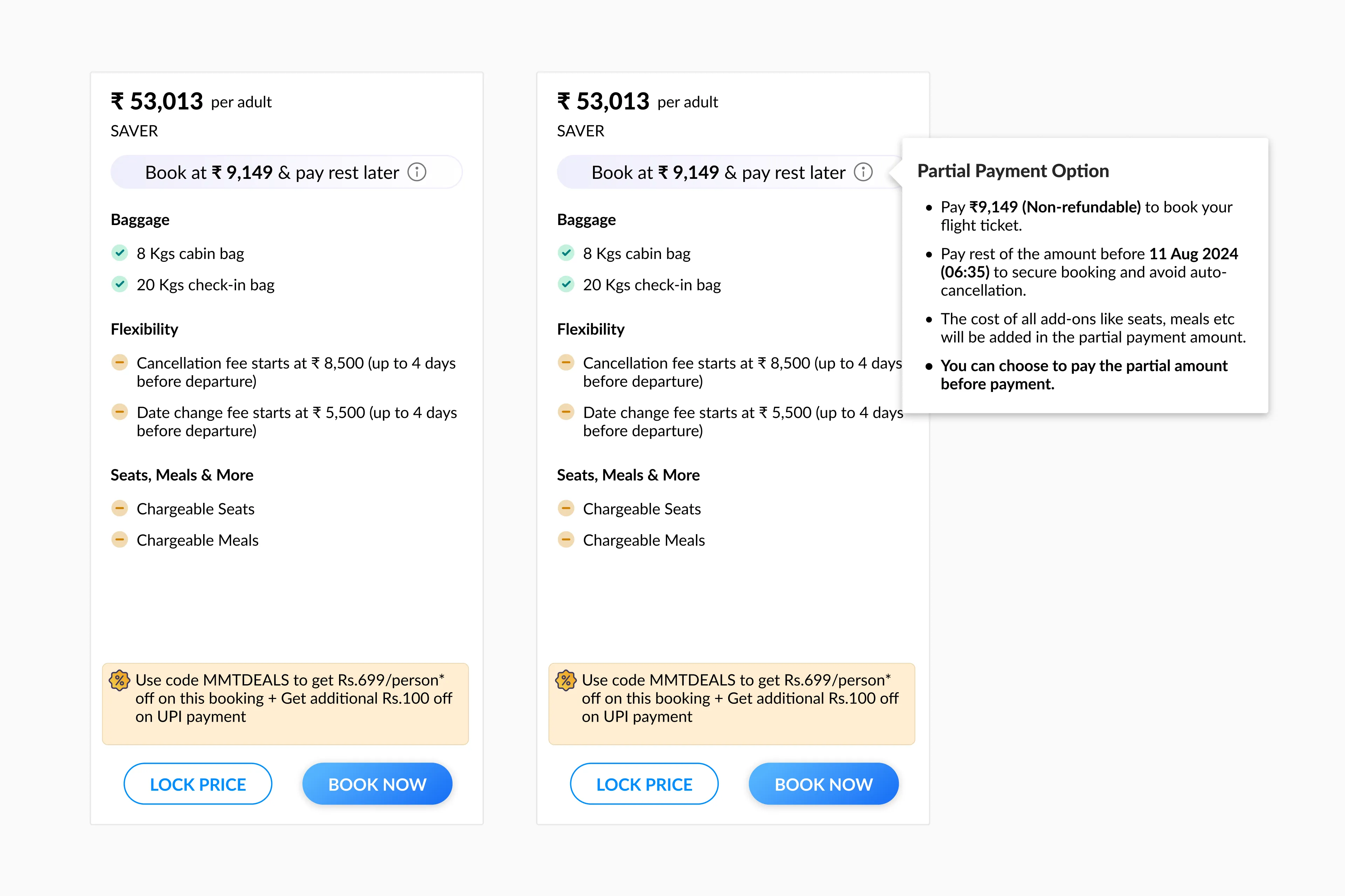 After extensive discussions with stakeholders, we decided that the final iteration should include not just the partial payment amount but also additional information such as: 1. Calling out that partial amount is non-refundable. 2. Deadline to pay remaining amount. 3. To call out that seats, meals, etc., add-ons will be included in the partial amount. 4. When the user can choose between partial payment and full payment. Here’s how fare family card will look like in action.